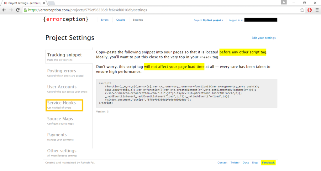 Step 1: Through, the custom Webhook integration in Errorception, go to Settings.