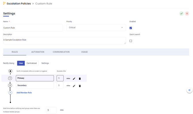 The Centralized preference notification setting escalates the alerts by escalation policies. Edit the member roles and wait times between notifications by clicking the edit button. Define which contact types are to be used for each role.