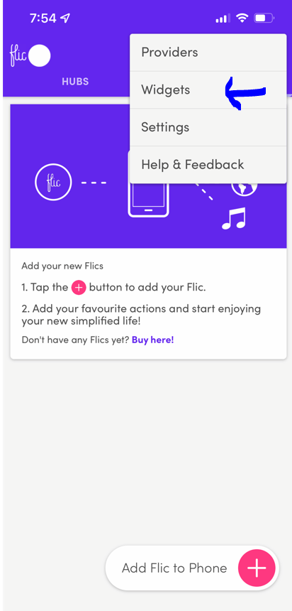 - In your Flic App (iOS or Android), select the three dots menu icon in the top right corner and select 'Widgets'