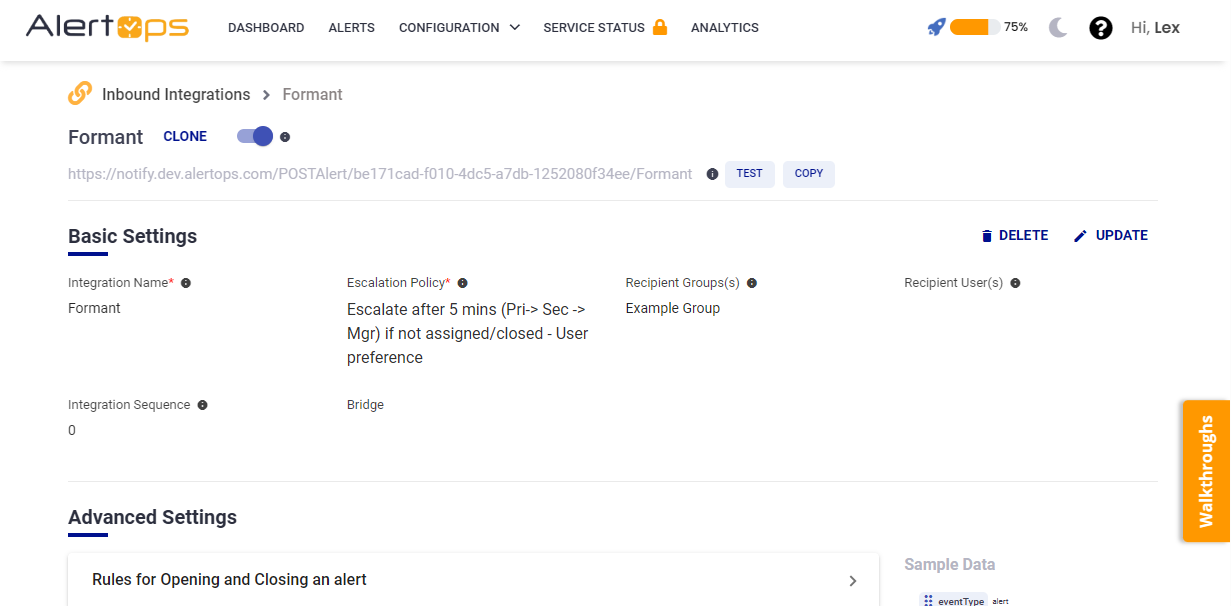 - Once you click save, the API Integration will be created, and you will be given a unique URL which acts as the access point and needs to be configured at the source (in this case Formant), to send alerts. You can find the integration you just created, and you can give advanced settings and define various configurations for the alerts to be received and processed. For example, you can define when to open and close alerts based on the payload obtained from the API call, filters etc