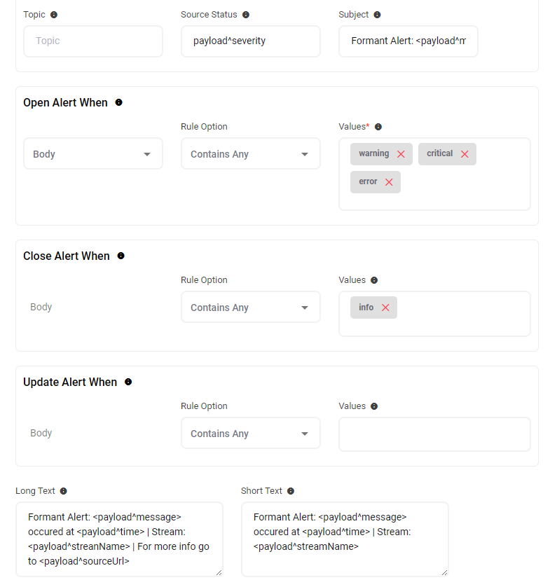 AlertOps will automatically create an incident when a new alert is received from Formant when the payload^severity contains "critical/warning/error".