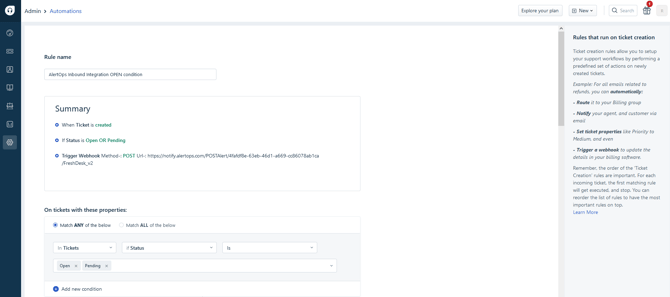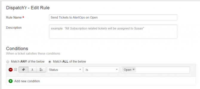 - Edit the rule. Enter the rule name ?Send Tickets to AlertOps on Open?. In the Conditions section, select the radio button ?Match ALL of the below?. Select ?Status? ?is? ?Open?. ?Description? ?Contains? ?AlertOps?