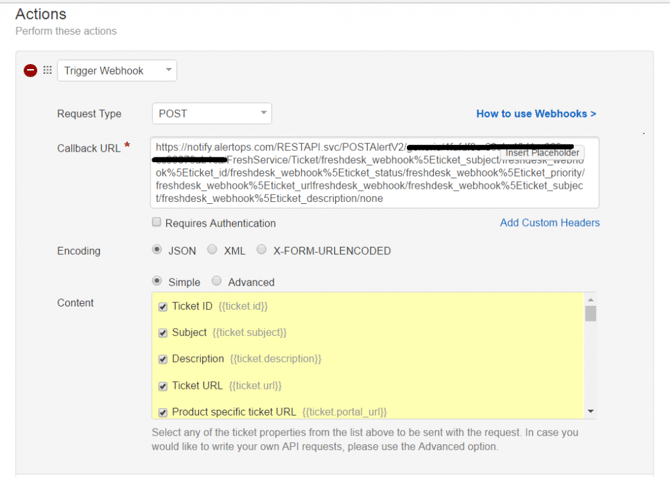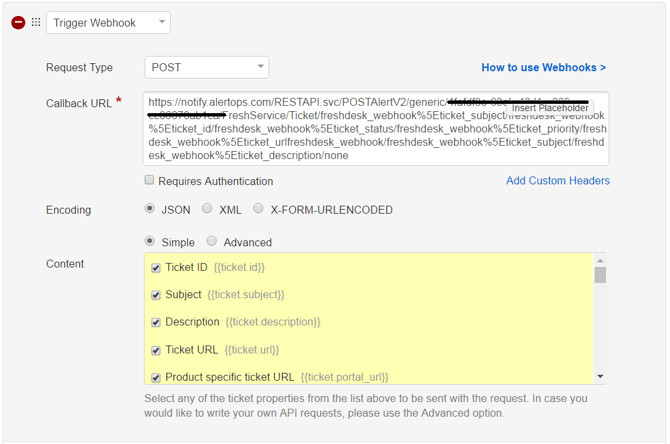 - In the Actions section, select ?Trigger webhook?. Callback URL = (your AlertOps URL from the Inbound Integration). Request Type = POST. Encoding = JSON. Content = Simple. Select all of the checkboxes in the content section. Click Save.