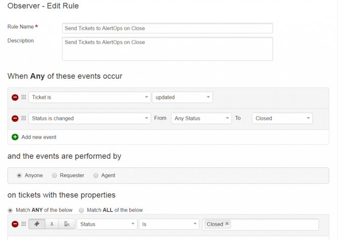 - Enter the Rule Name ?Send Tickets to AlertOps on Close?. In the Conditions sections, select ?When ALL of these events occur? ?Ticket is? ?updated? ?Status is changed? from ?any status? to ?closed? and the events are performed by ?anyone? and ?Description? ?Does not Contain? ?AlertOps?