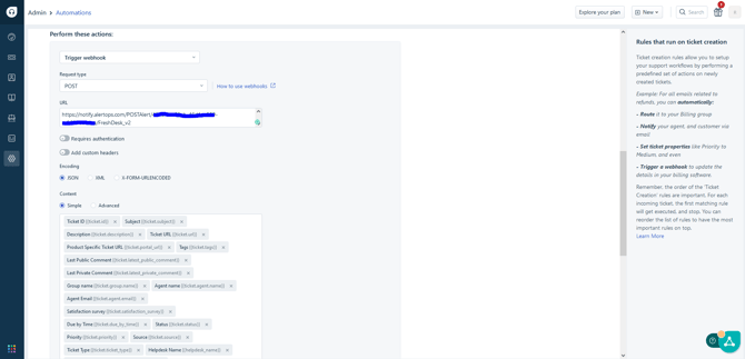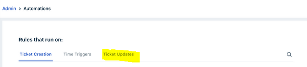 - Go to the Automations page again, select the tab 'Ticket Updates'