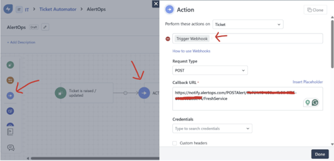 4.Select 'Action' in the left, drag and add it to the flow. Select the action as 'Trigger Webhook' , request type is POST, under Callback URL, paste the AlertOps inbound integration URL.
