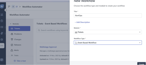 2) Select 'Tickets' under Modules, click on 'New Work7ow'. Give a Title, select type as Event Based Workflow.