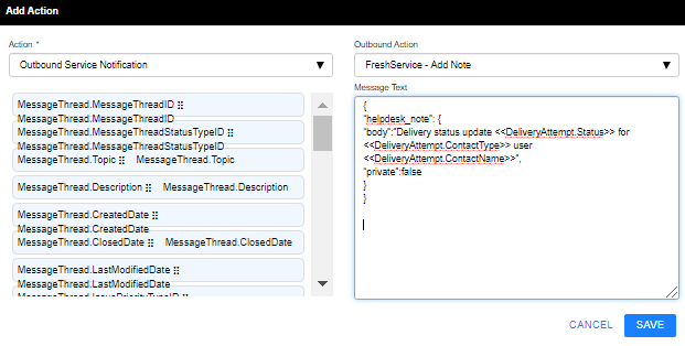 Outbound Action = FreshService – Add Note