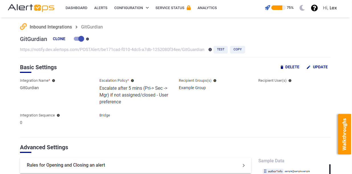 - Make a note of the API URL, which will be used in GitGuardian, so it calls a HTTP POST request to this URL with the body in JSON format containing the alert specific information. AlertOps automatically creates an alert when the status variable (severity) contains 'critical/high'. The incident will also be closed automatically when the status 'low/info' is received from GitGuardian.