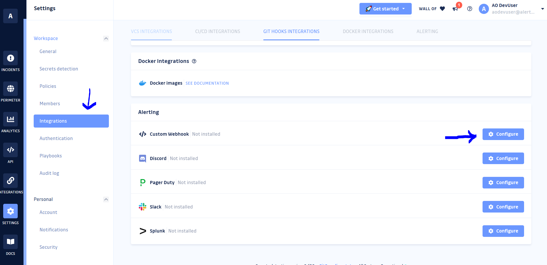 - In your GitGuardian portal, go to 'Settings' in the left navigation menu. Under Workspaces, select Integrations