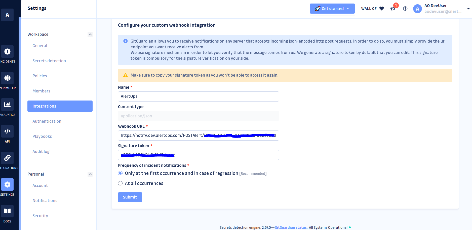 The above scenario and scope for integration is due to the fact that AlertOps has a very flexible and simple API/Webhook configuration feature that can be leveraged with GitGuardian's alert and notification capabilities.