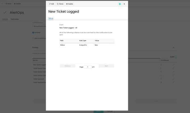 - Under Events make sure you have events for New Tickets Logged, and Ticket Status Changed/Updated scenarios (statuses are added as conditions inside the event). You can define events however you want. Just make sure that they are mapped in AlertOps accordingly.