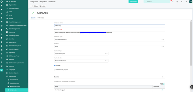 - Make a note of the API URL, which will be used in HaloITSM, so it calls a HTTP POST request to this URL with the body in JSON format containing the alert specific information. AlertOps automatically creates an alert when the status variable (ticket^status^name) contains 'New'. The incident will also be closed automatically when the status 'Closed' is received from HaloITSM