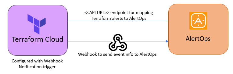 At a high level this is how the flow looks like, you define an API integration in the AlertOps platform by defining settings like Integration Name, Escalation rules, recipient users/groups. Once an integration is defined, a unique API URL is generated. This acts as webhook or the gateway through which notifications from Terraform Cloud reach AlertOps and thus an incident/alert is created correspondingly. The API can be defined with various settings like URL mappings, filters, escalations etc. as required. Terraform Cloud has to be defined with a Wehook notification trigger.