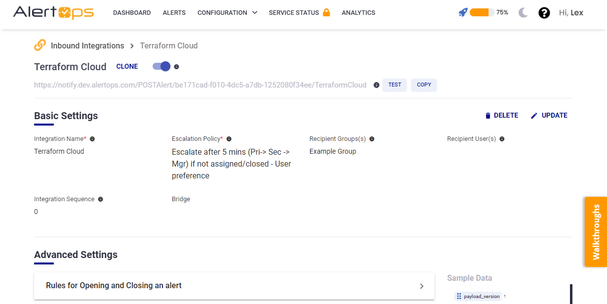 - Once you click save, the API Integration will be created, and you will be given a unique URL which acts as the access point and needs to be configured at the source (in this case Terraform Cloud), to send alerts. You can find the integration you just created, and you can give advanced settings and define various configurations for the alerts to be received and processed. For example, you can define when to open and close alerts based on the payload obtained from the API call, filters etc.