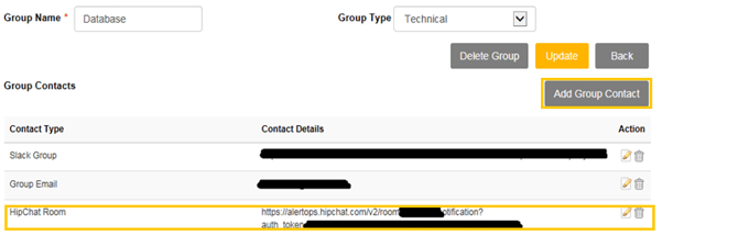 Update the group contact in your Alertops group with Hipchat “Send messages to this room by posting to this URL”