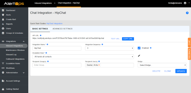 - Enter a name for the integration. Select an escalation rule to determine the integration's escalation policy. And, enter the names of recipient group(s) and recipient user(s). Click 'SAVE.' Then, click 'COPY URL' to copy the URL endpoint to be used in the HipChat configuration. You can also test API URL by clicking ‘TEST URL’.