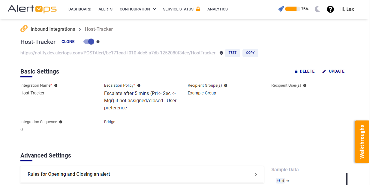 - Once you click save, the API Integration will be created, and you will be given a unique URL which acts as the access point and needs to be configured at the source (in this case Host-Tracker), to send alerts. You can find the integration you just created, and you can give advanced settings and define various configurations for the alerts to be received and processed. For example, you can define when to open and close alerts based on the payload obtained from the API call, filters etc.
