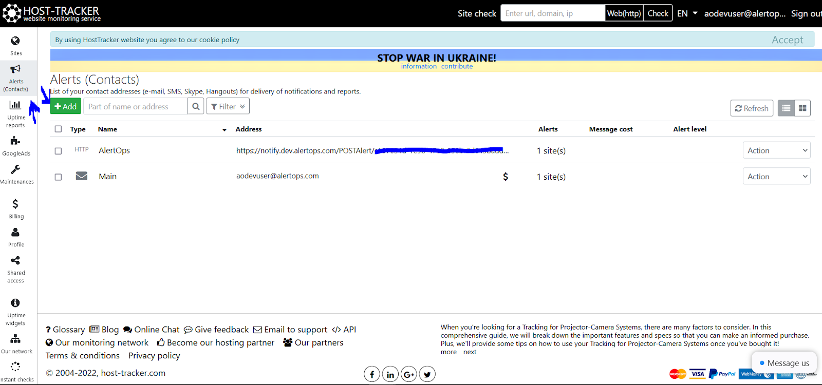 - In your Host-Tracker portal, in the left navigation pane, select 'Alerts (Contacts)'