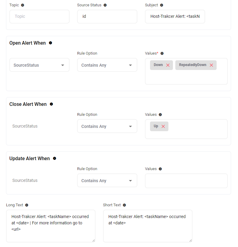 AlertOps will automatically create an incident when a new alert is received from Host-Tracker when the id contains "Down/RepeatedlyDown".