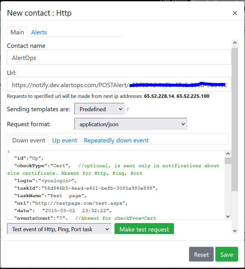 - Make a note of the API URL, which will be used in Host-Tracker, so it calls a HTTP POST request to this URL with the body in JSON format containing the alert specific information. AlertOps automatically creates an alert when the status variable (id) contains 'Down/RepeatedlyDown'. The incident will also be closed automatically when the status 'Up' is received from Host-Tracker.