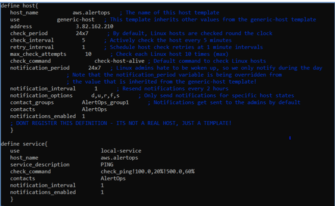 - Let’s take an example where we monitor a host (in this case an AWS EC2 instance), and a service object to check its PING information. These objects are attached to a contact called “AlertOps” and a contact group called “AlertOps_group1”, which are again defined as contact objects attached to notification command objects.
