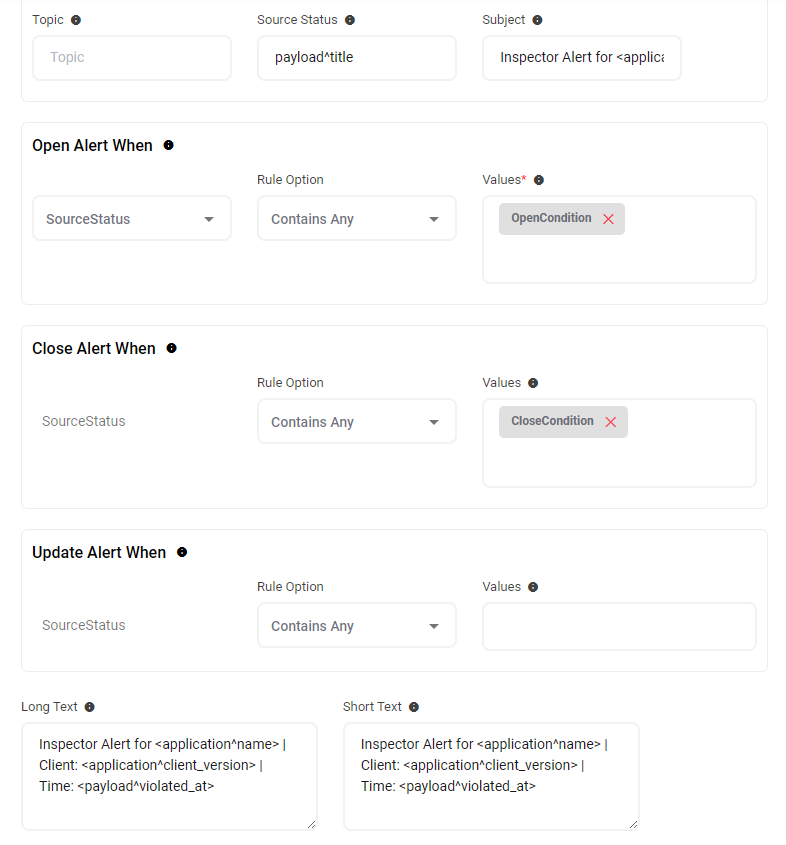 AlertOps will automatically create an incident when a new alert is received from Inspector when the payload^title contains "OpenCondition".