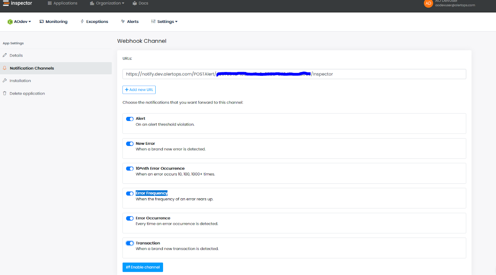 - In your Inspector portal, go to your application, and under Settings, select Notification Channels.