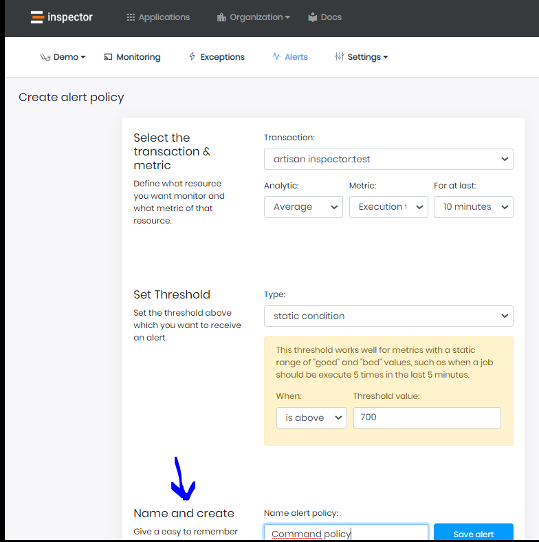 - When you create the policy, ensure that the 'Name and Create' section contains the string 'OpenCondition' for open alert policy, and 'CloseCondition' for the close alert policy.