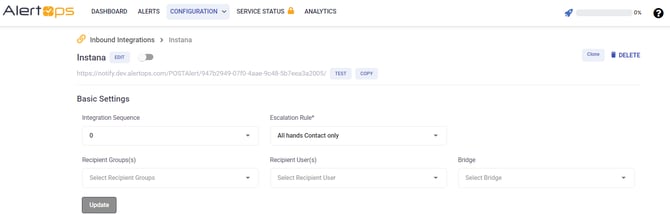 - Once you click save, the API Integration will be created, and you will be given a unique URL which acts as the access point and needs to be configured at the source (in this case Instana), to send notifications. You can find the integration you just created, and you can give advanced settings and define various configurations for the alerts to be received and processed. For example, you can define custom conditions as when to open and close alerts based on the response obtained from the API call, filters for the incoming JSON payload etc.