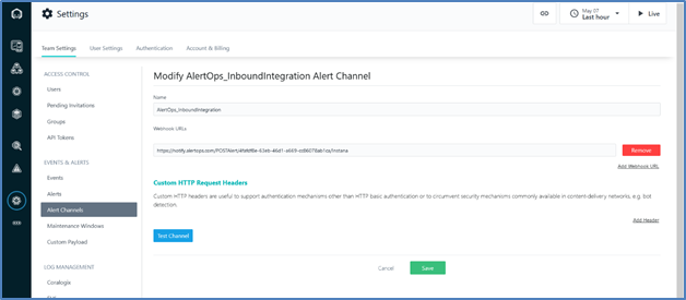 - Give a name to the channel and paste the API URL in the Webhook URLs field. You can also provide custom headers if required. You can test the URL. Click Save.