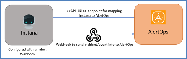 At a high level this is how the flow looks. You define an API integration in the AlertOps platform by defining settings like Integration Name, Escalation rules, recipient users/groups. Once an integration is defined, a unique API URL is generated. This acts as webhook or the gateway through which events from Instana reach AlertOps and thus an incident/alert is created correspondingly. The API can be defined with various settings like URL mappings, filters, escalations etc. as required. You will have to create a Webhook in Instana to send event information.