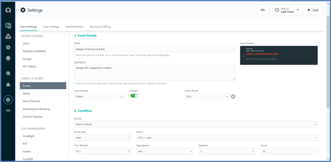 - Click “New Event”. In the first part, give a name, description for the event. You can define the type of issue severity (Critical or Warning), for which you want to create events and consequent alerts.
