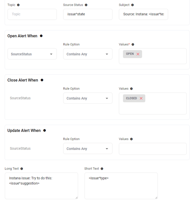 AlertOps will automatically create an incident when a new alert is received from Instana when the issue^state field contains “OPEN”.