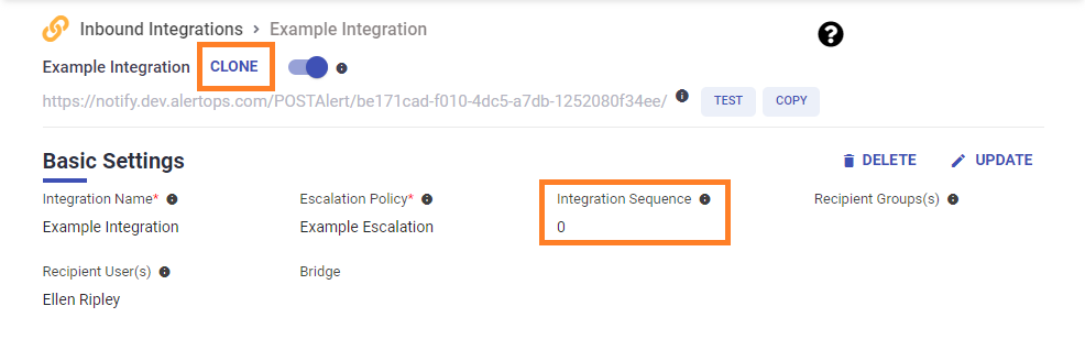 In the above example, we have cloned an Integration, it has received the Integration Sequence of 1 and this means it will be processed second. The clone has a separate escalation policy as well as a different recipient user associated.
