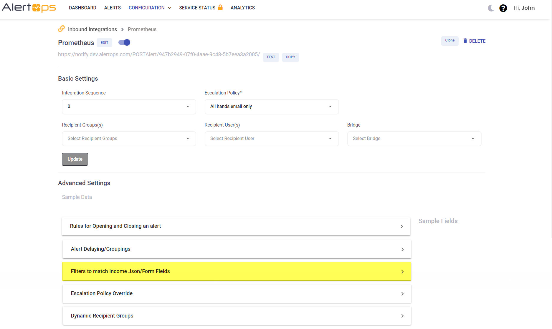 Cloning alone does not provide any real difference between the Integrations, so with no further change, the second Integration above will never produce an Alert, as the first one will process all alerts. This is where Filters come into play. In Advanced Settings, expand Filters To Match Incoming Json/Form Fields.
