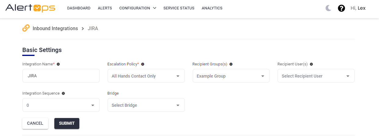 - To set up the integration, enter a name for the integration. Select an Escalation Policy to guide escalations coming from this Integration. And enter the names of recipient group(s) and recipient user(s).