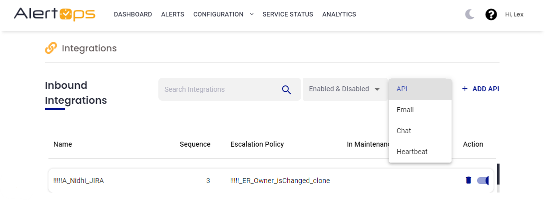 - In the Inbound Integration section, select API from the integration type dropdown menu.
