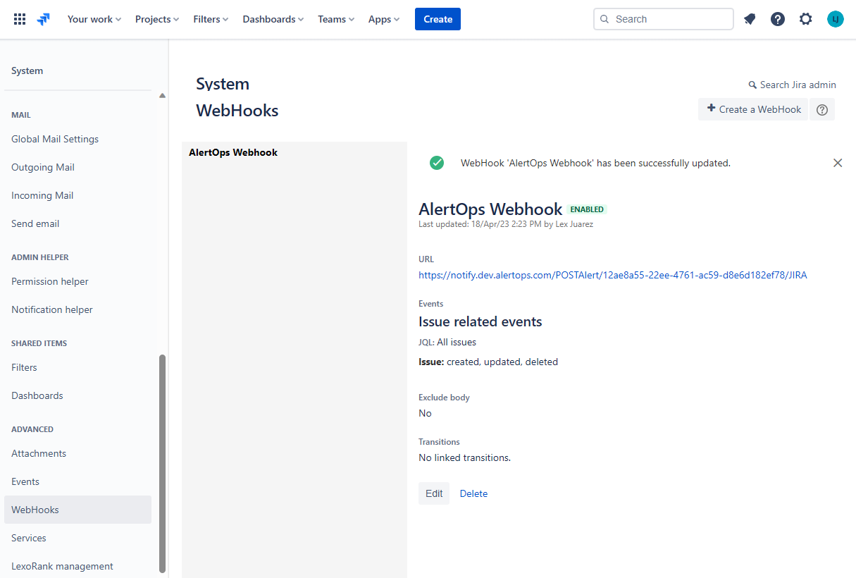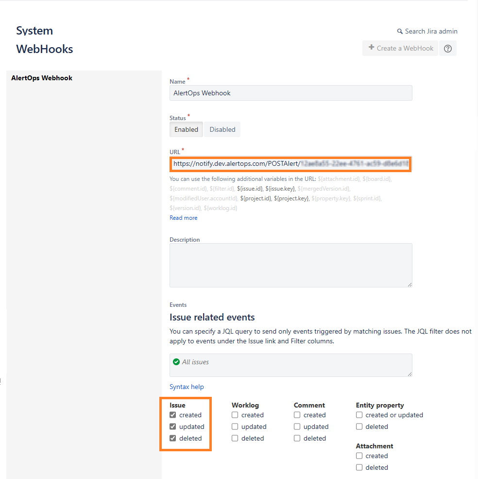 - Paste the URL endpoint from the Integration we created in AlertOps and select the Issues that will create alerts in AlertOps.