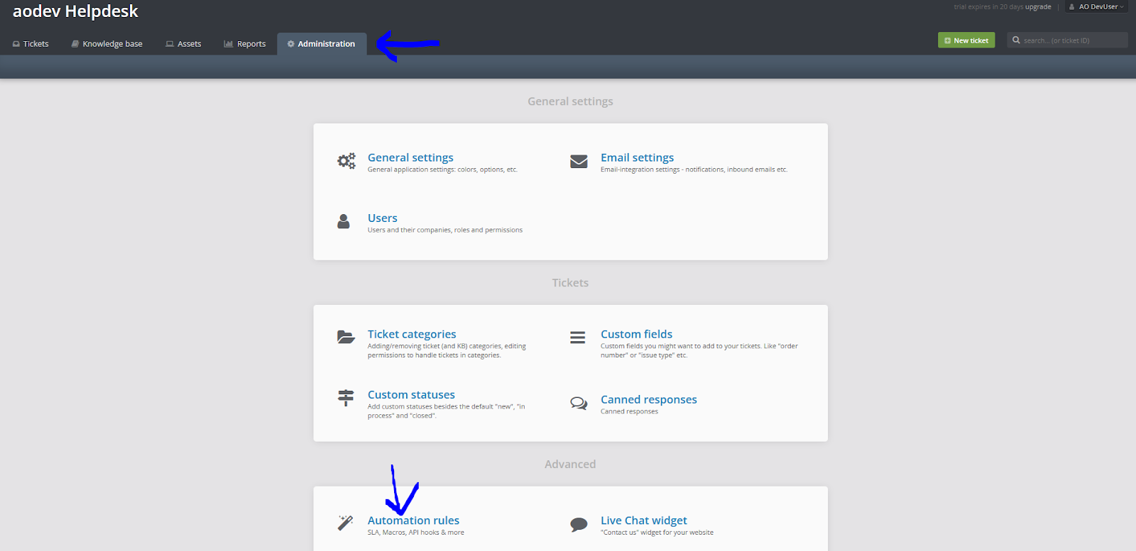 - In your JitBit cloud portal, go to the 'Administration' section and under 'Advanced', select 'Automation Rules'