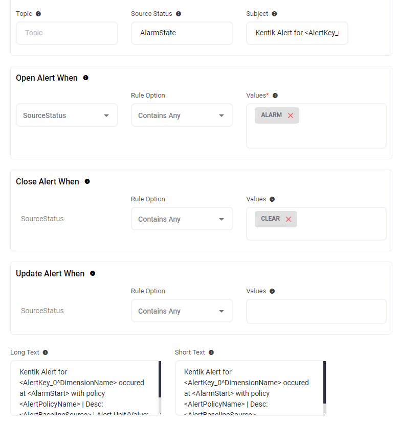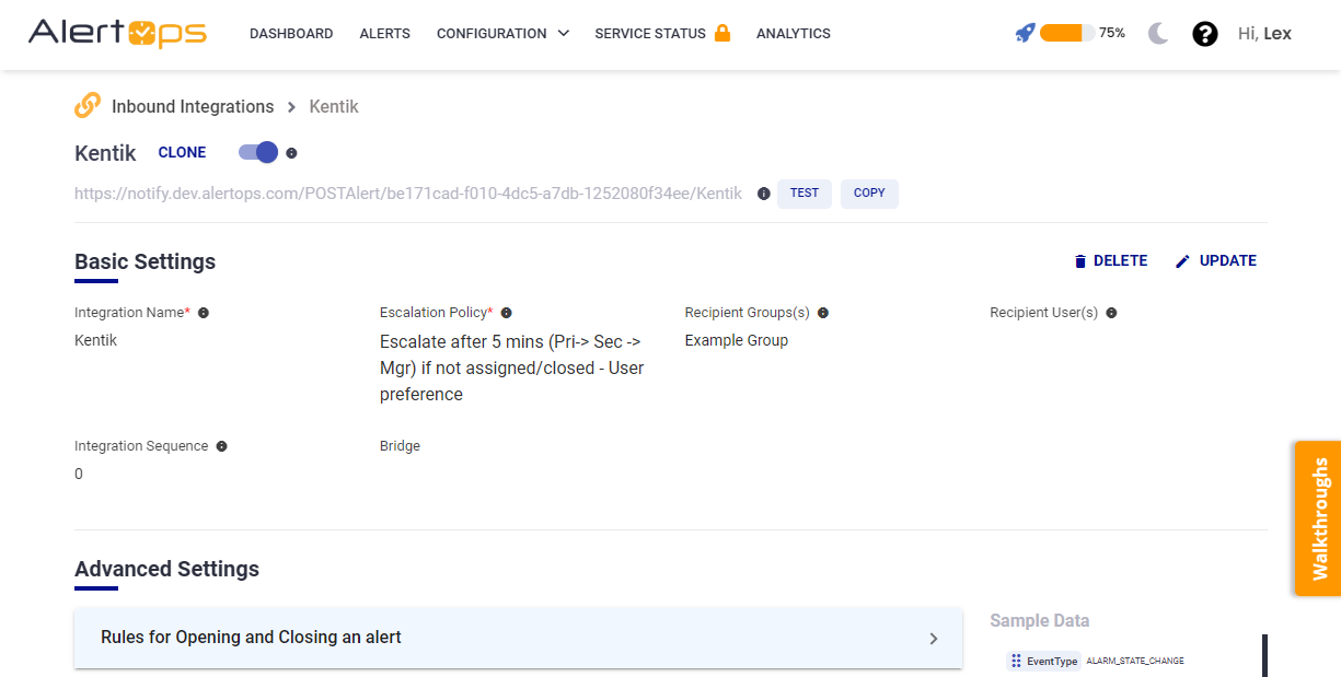 - You can similarly define Rules for Opening and Closing Alerts as you want in Advanced settings, owing to the flexibility provided by AlertOps� OpenAPI/Plug-and-Play integrations. You can provide other filters and match with regex expressions as well. You can also test the generated URL with the sample data provided.