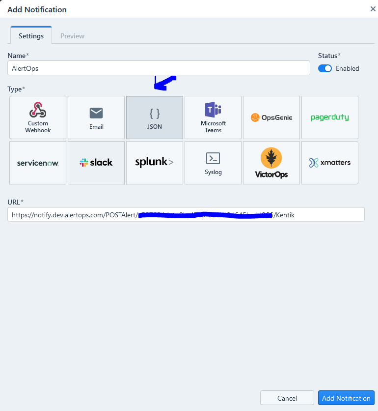 - Make a note of the API URL, which will be used in Kentik, so it calls a HTTP POST request to this URL with the body in JSON format containing the alert specific information. AlertOps automatically creates an alert when the status variable (AlarmState) contains 'ALARM'. The incident will also be closed automatically when the status 'CLEAR' is received from Kentik.
