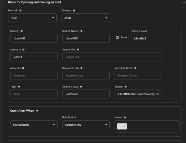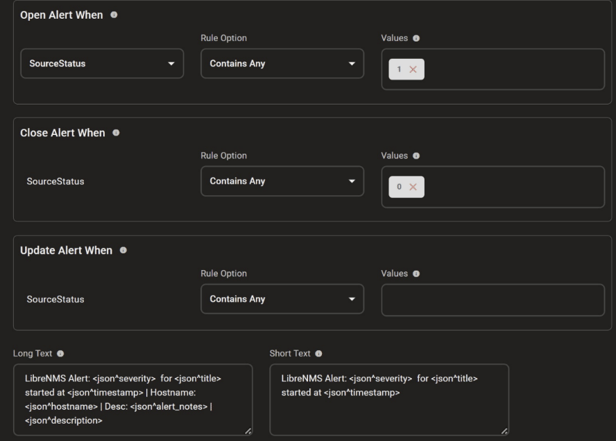 AlertOps will automatically create an incident when a new alert is received from LibreNMS with an IncidentStatus status of “open”.