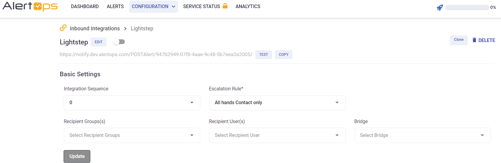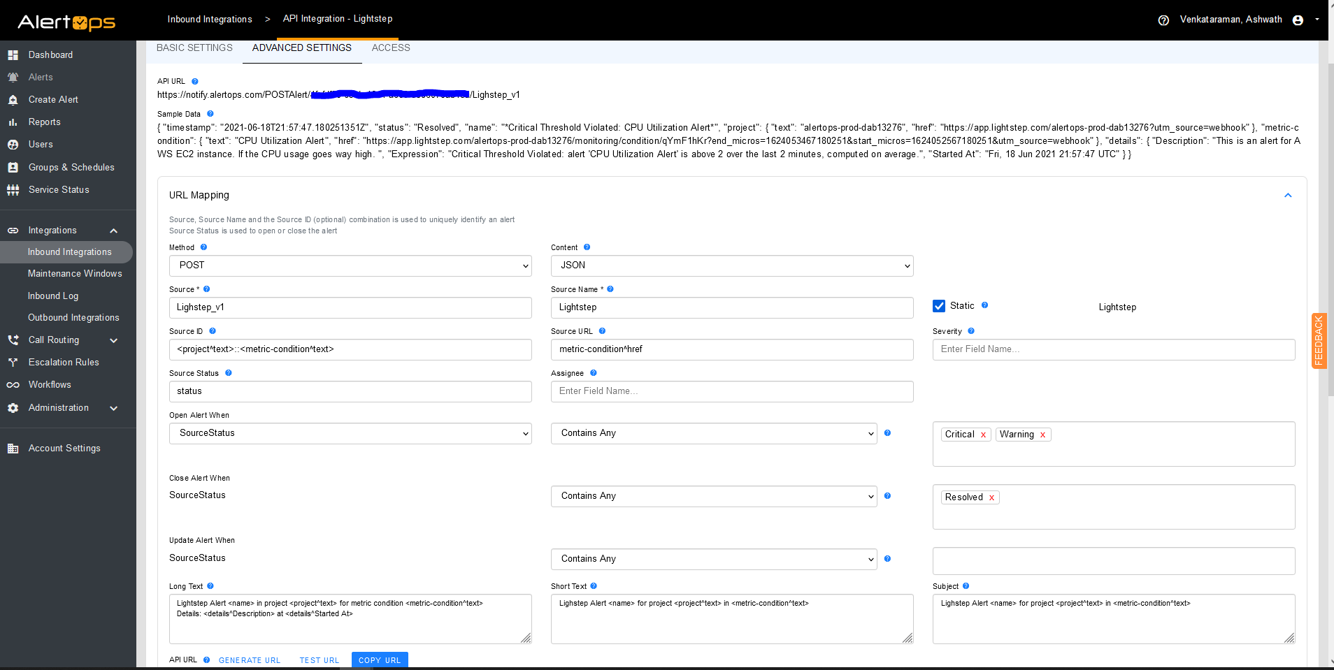 - Once you click save, you will be given a unique URL which acts as the access point and needs to be configured at the source (in this case Lightstep), to send alerts. You can find the integration you just created, and you can give advanced settings and define various configurations for the alerts to be received and processed. For example, you can define when to open and close alerts based on the payload obtained from the API call, filters etc.