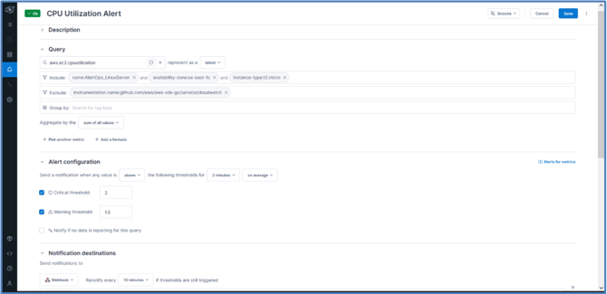 - Under Alert Configuration, you can specify the threshold to send the notification (the ‘Critical and Warning’ thresholds). For this example, we define the query as ‘aws.ec2.cpuutilization’ and the thresholds as 2 and 1.5, then send a notification webhook with the alert payload to the notification destination you defined. You can also view the threshold analysis chart. Click ‘Save’.