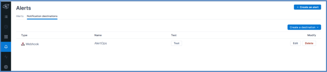 - In the left navigation pane select ‘Alerts’ and then select ‘Notification destinations. In the right corner select ‘Create a Destination’ and then select ‘Webhook’