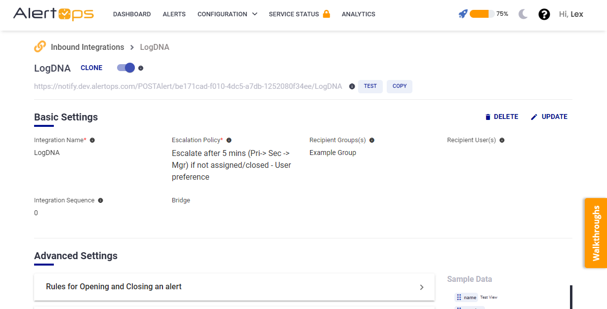 - Once you click save, the API Integration will be created, and you will be given a unique URL which acts as the access point and needs to be configured at the source (in this case LogDNA), to send alerts. You can find the integration you just created, and you can give advanced settings and define various configurations for the alerts to be received and processed. For example, you can define when to open and close alerts based on the payload obtained from the API call, filters etc.