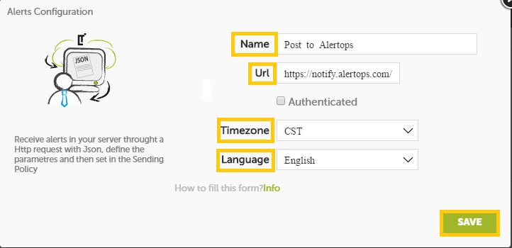 - Enter the names of recipient group(s) and recipient user(s). Click 'SAVE.' Then, click 'COPY URL' to copy the URL endpoint to be used in the Logtrust configuration.