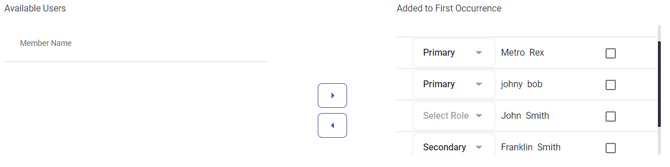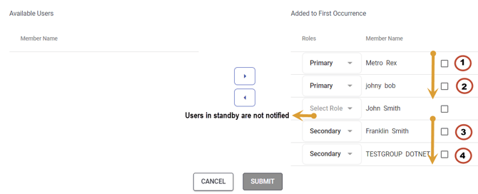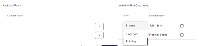 For rotating schedules, you may select the Primary and Secondary member roles for group members who will be on-call for the first period. Then you may choose the Rotating for users on Standby and will be rotated into a role. Users on Standby for a shift will not be notified until they are rotated into an on-call role.