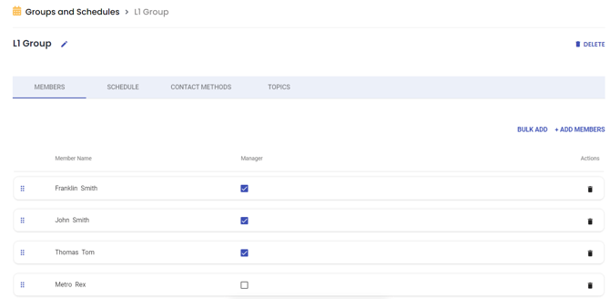 In each group, users can have one of three active member roles: Primary, Secondary, or Manager. Additionally, a member may have no role (blank), allowing for members who are not active during the current period, but who will rotate into active status in later periods. These member roles determine escalation behavior when an alert is received.